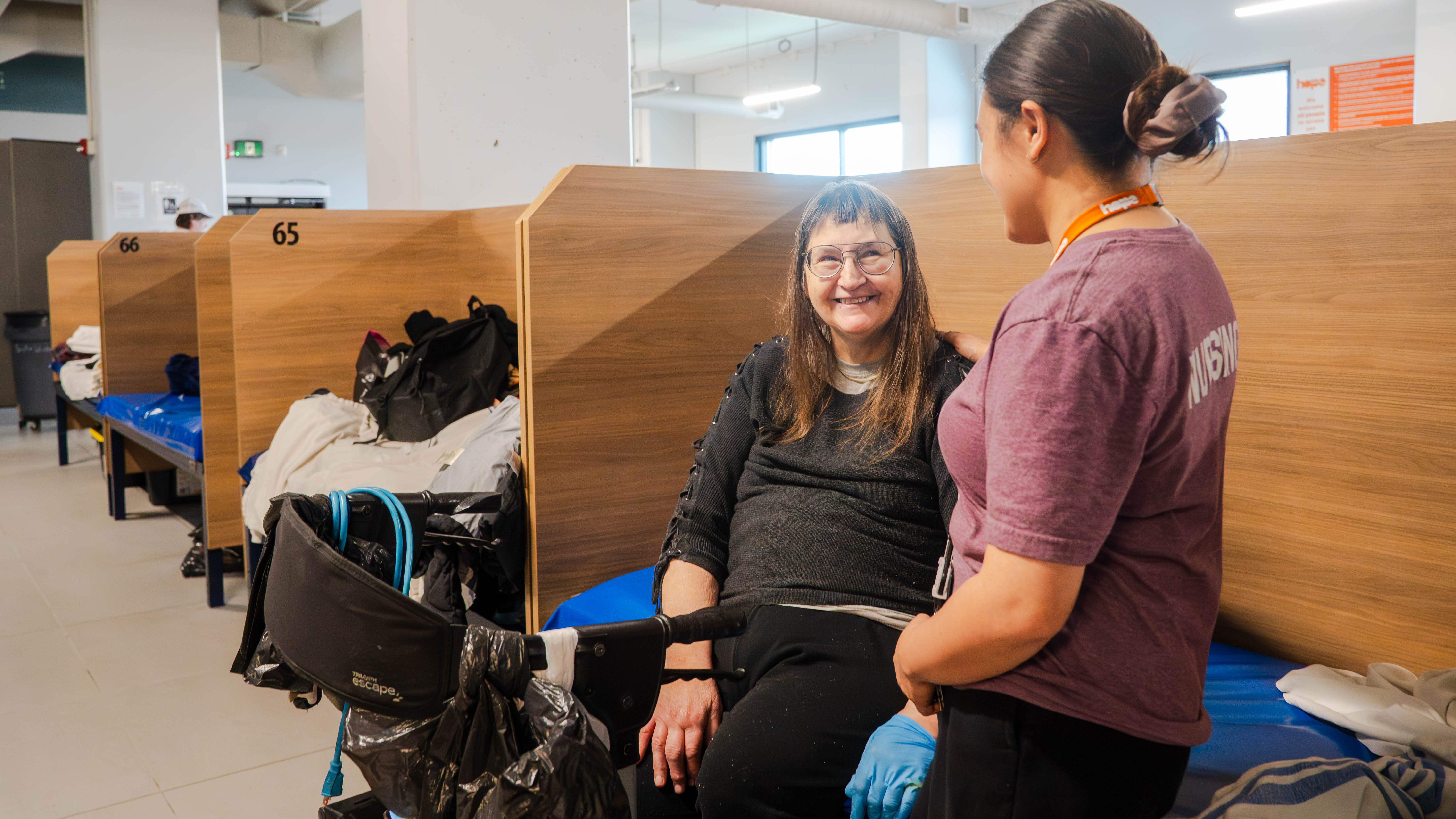 Located on the main floor of the Herb Jamieson Centre, the Health Shelter provides 24/7 medically supported shelter care for individuals who are medically stable yet require ongoing health support. Care is delivered by Healthcare Aides, Licensed Practical Nurses, Registered Nurses, and Nurse Practitioners (daytime clinical coverage). The team provides continuous health monitoring, medication support, basic treatments, and coordinated care within a safe, stabilized environment where both medical and social supports are always accessible.